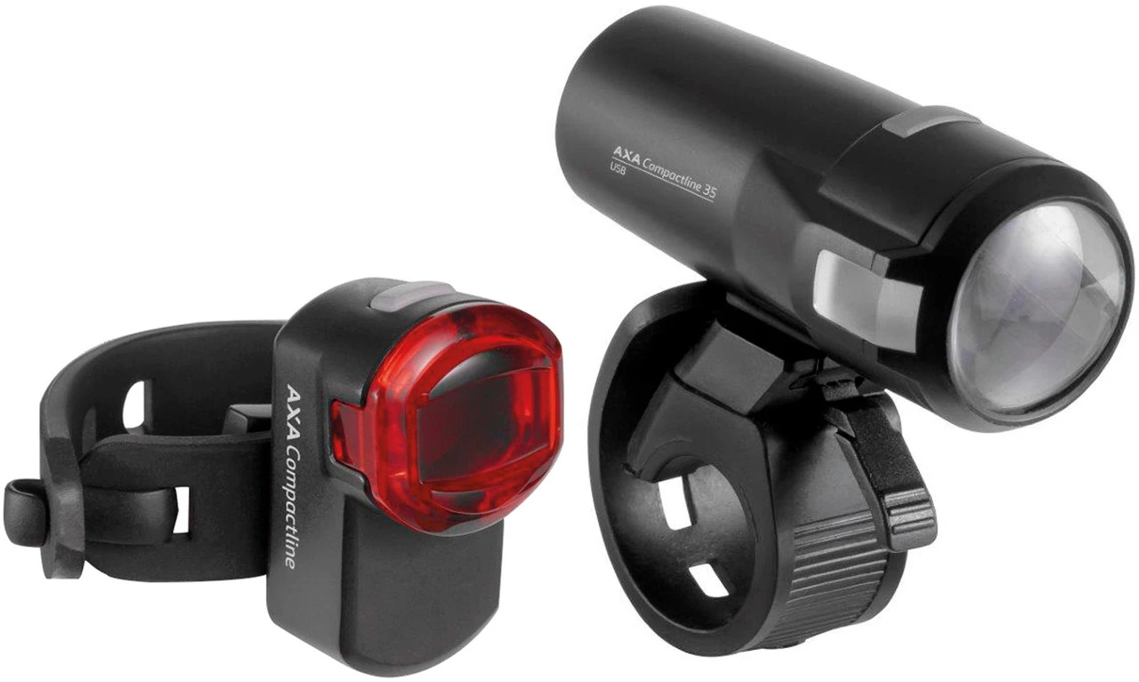Klein, hell und gut sichtbar: das Compactline 35 USB Frontlicht + Compactline Rear Rücklicht von Axa