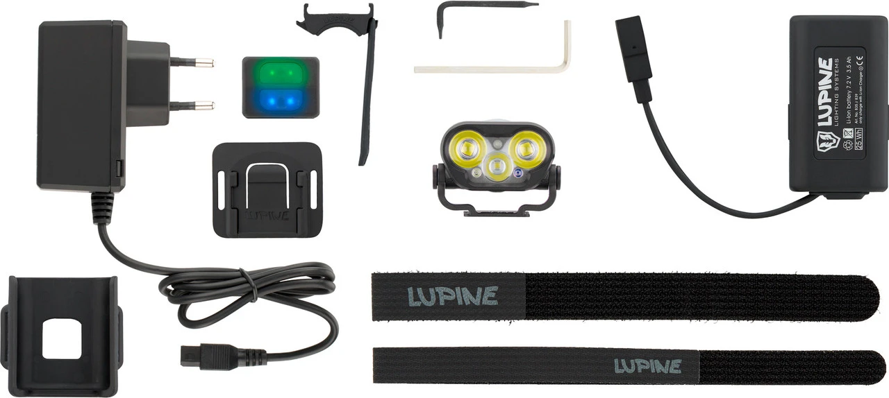 Lieferumfang:1 x Lampenkopf Lupine Blika R1 x Li-Ion Akku Lupine FastClick 3,5 Ah1 x Fernbedienung Lupine Bluetooth1 x Helmhalter Lupine FrontClick1 x Akkuhelmhalter Lupine FastClick1 x Lenkerhalterung Lupine Peppi V51 x Ladegerät Lupine Wiesel2 x Klettband Lupine