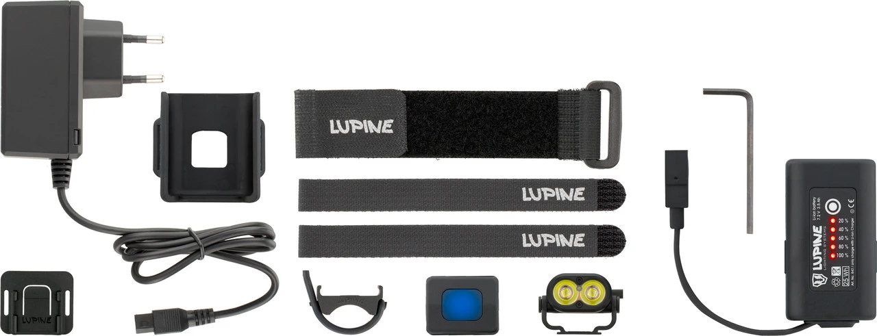 Lieferumfang:1 x Lampenkopf Lupine Piko R1 x Li-Ion Akku Lupine SmartCore FastClick 3,5 Ah1 x Fernbedienung Lupine Bluetooth1 x Helmhalter Lupine FrontClick1 x Lenkerhalterung Lupine Peppi V51 x Akkuhelmhalter Lupine FastClick1 x Ladegerät Lupine Wiesel2 x Klettband Lupine