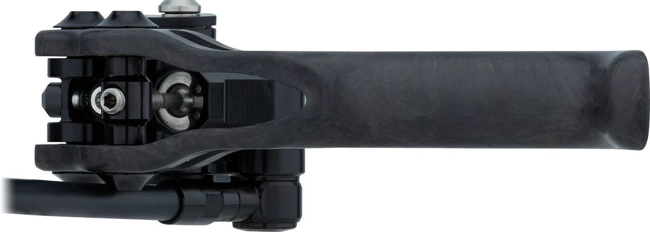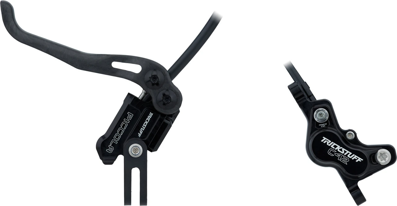Die Piccola Carbon HD Scheibenbremse von Trickstuff liefert im Mountainbike-Einsatz mit ihren vier Kolben starke, zuverlässige Bremspower und punktet dabei mit sehr niedrigem Gewicht. Die minimalistische Bauweise sowie der Carbonhebel sind namensgebend und machen den Bremsgriff besonders leicht. Der C42-Bremssattel, der auch bei der Direttissima zum Einsatz kommt, bietet einen klaren Druckpunkt und ist durch seine polierten Edelstahlkolben äußerst hitzebeständig. Mit Temperaturstabilität glänzt auch das verwendete Bionol, welches zudem biologisch abbaubar ist. Die Griffweite stellst Du für Dich passend ein, der 4-fach kugelgelagerte Hebel ist leichtgängig und ermöglicht Dir eine feine Dosierung.